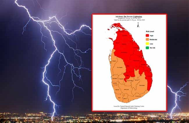 ප්‍රදේශ කිහිපයක් සඳහා කාලගුණවිද්‍යා දෙපාර්තමේන්තුව විසින් ප්‍රබල අකුණු පිළිබඳ අවවාදාත්මක නිවේදනයක් නිකුත් කර තිබේ.