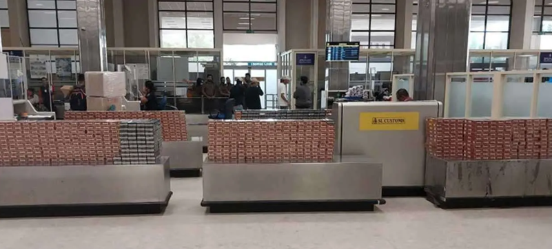 රුපියල් හාර කෝටි පනස් ලක්ෂ අනූ දහසක් වටිනා විදේශීය නිෂ්පාදිත දුම්වැටි තොගයක් නීතිවිරෝධී ලෙස මෙරටට රැගෙන විත්, ඒවා කටුනායක ගුවන් තොටුපොළ කිසිවක් ප්‍රකාශ කිරීමට නොමැති ” හරිත මාවත ” ඔස්සේ පිට කර ගෙන යාමට තැත් කළ ශ්‍රී ලාංකික ගුවන් මගීන් තිදෙනෙකු අද(27 ) අලුයම ගුවන් තොටුපොළ පැමිණීමේ පර්යන්තයේ දී රේගු මත්ද්‍රව්‍ය පාලන අංශයේ නිලධාරීන් පිරිසක් විසින් අත් අඩංගුවට ගෙන තිබේ.