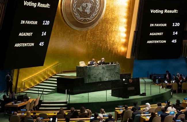 ඊශ්රායල – පලස්තීන ගැටලුව සඳහා ද්වි-රාජ්යය පිළියමක් ඇතිකිරීම සඳහා වන යෝජනාවක් එක්සත් ජාතීන්ගේ මහා මණ්ඩලයේදී ඊයේ සම්මත කෙරිණි.