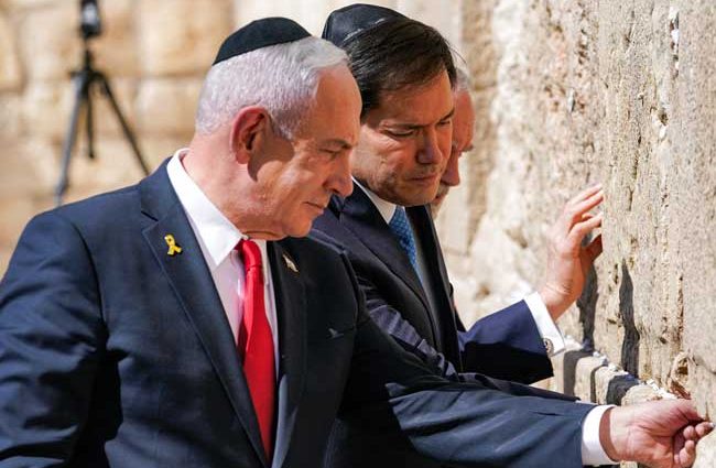 ඊශ්‍රායලයේ සංචාරයක නිරත අමෙරිකානු රාජ්‍ය ලේකම් මාර්කෝ රූබියෝ ජෙරුසෙලමේ ශුද්ධ වූ බටහිර ප්‍රාකාරය වෙත ගෞරව දක්වා තිබේ.