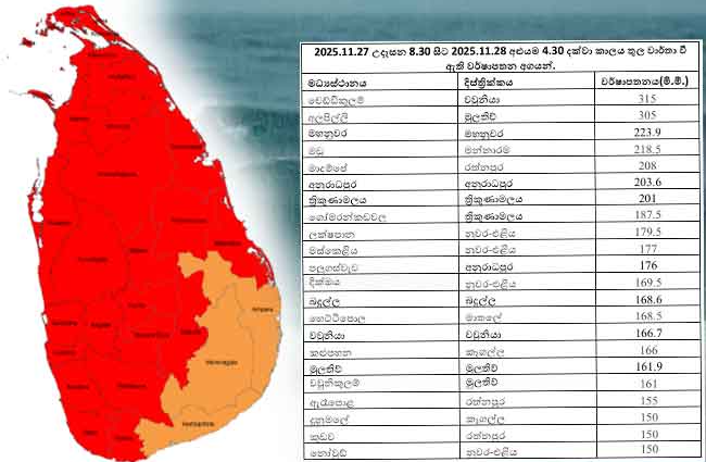 ඊයේ (27) පෙ.ව. 8.30 සිට අද (28) අලුයම 4.30 දක්වා වූ කාලය තුළ වාර්තා වූ වර්ෂාපන අගයන් සැලකිල්ලට ගෙන මෙම තොරතුරු ඉදිරිපත් කර ඇත.