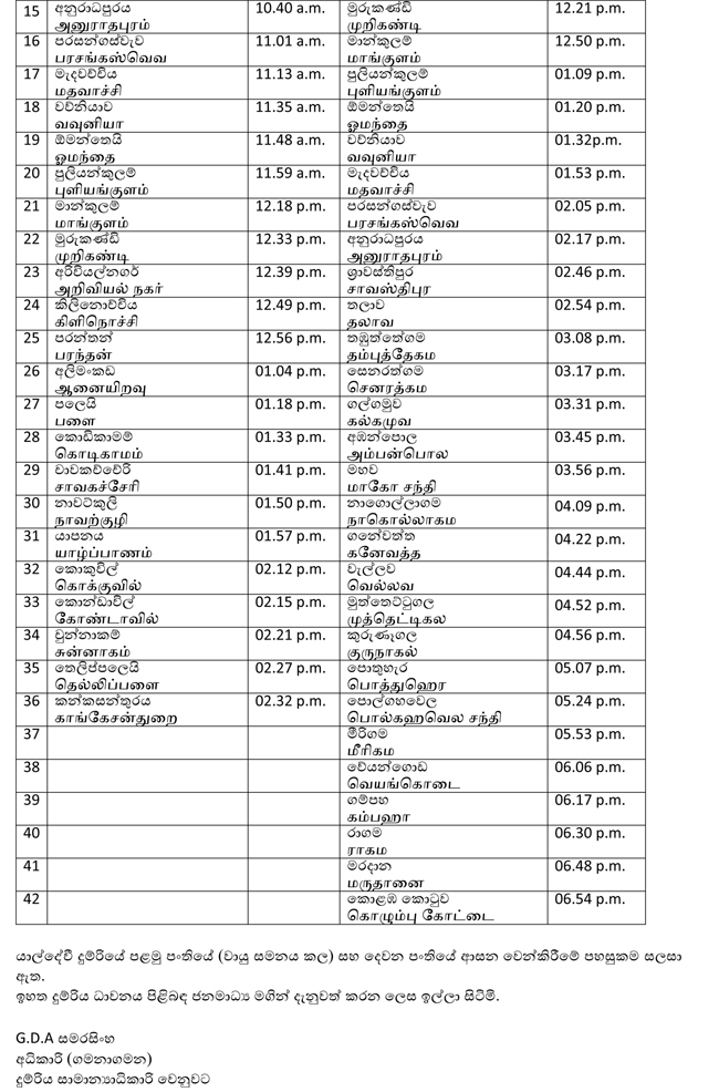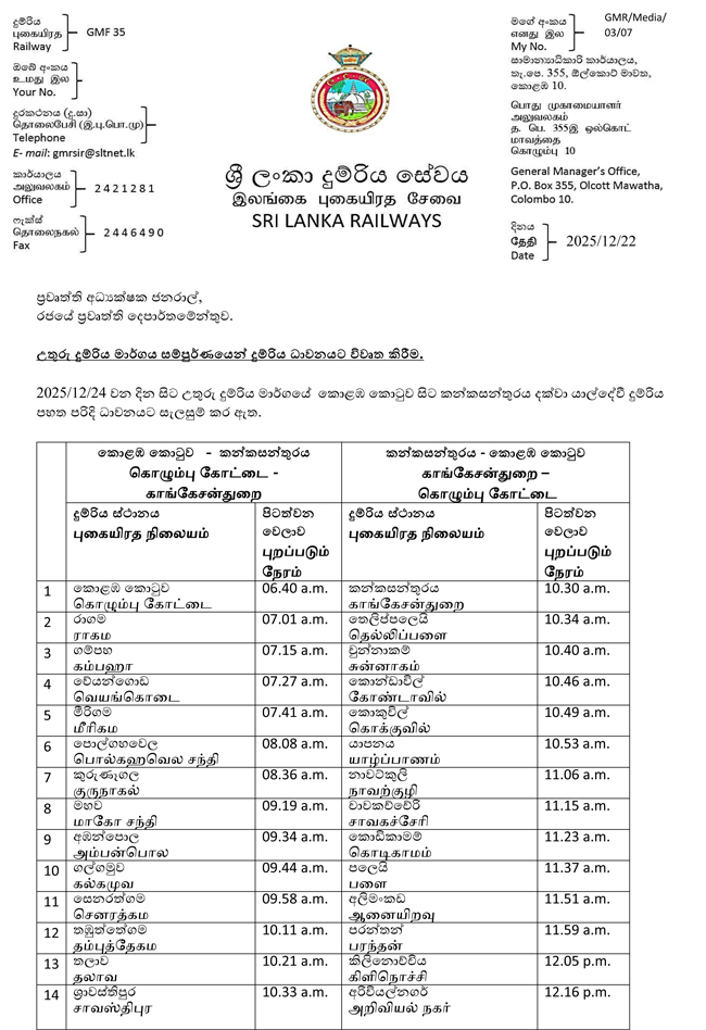 ඒ අනුව, අනිද්දා (24) සිට උතුරු දුම්රිය මාර්ගයේ කොළඹ කොටුව සිට කන්කසන්තුරය දක්වා යාල්දේවී දුම්රිය පහත පරිදි ධාවනයට සැලසුම් කර ඇත.